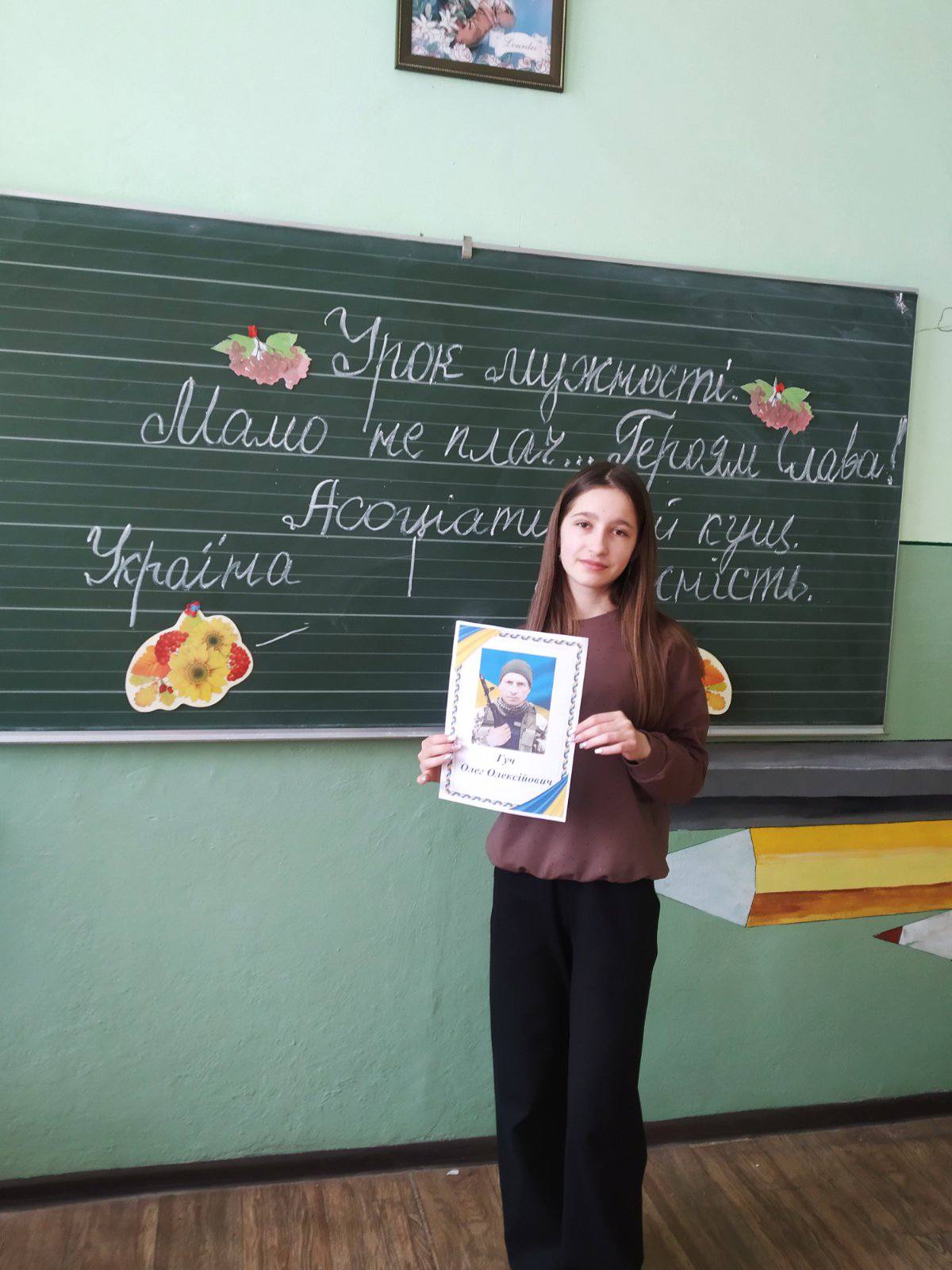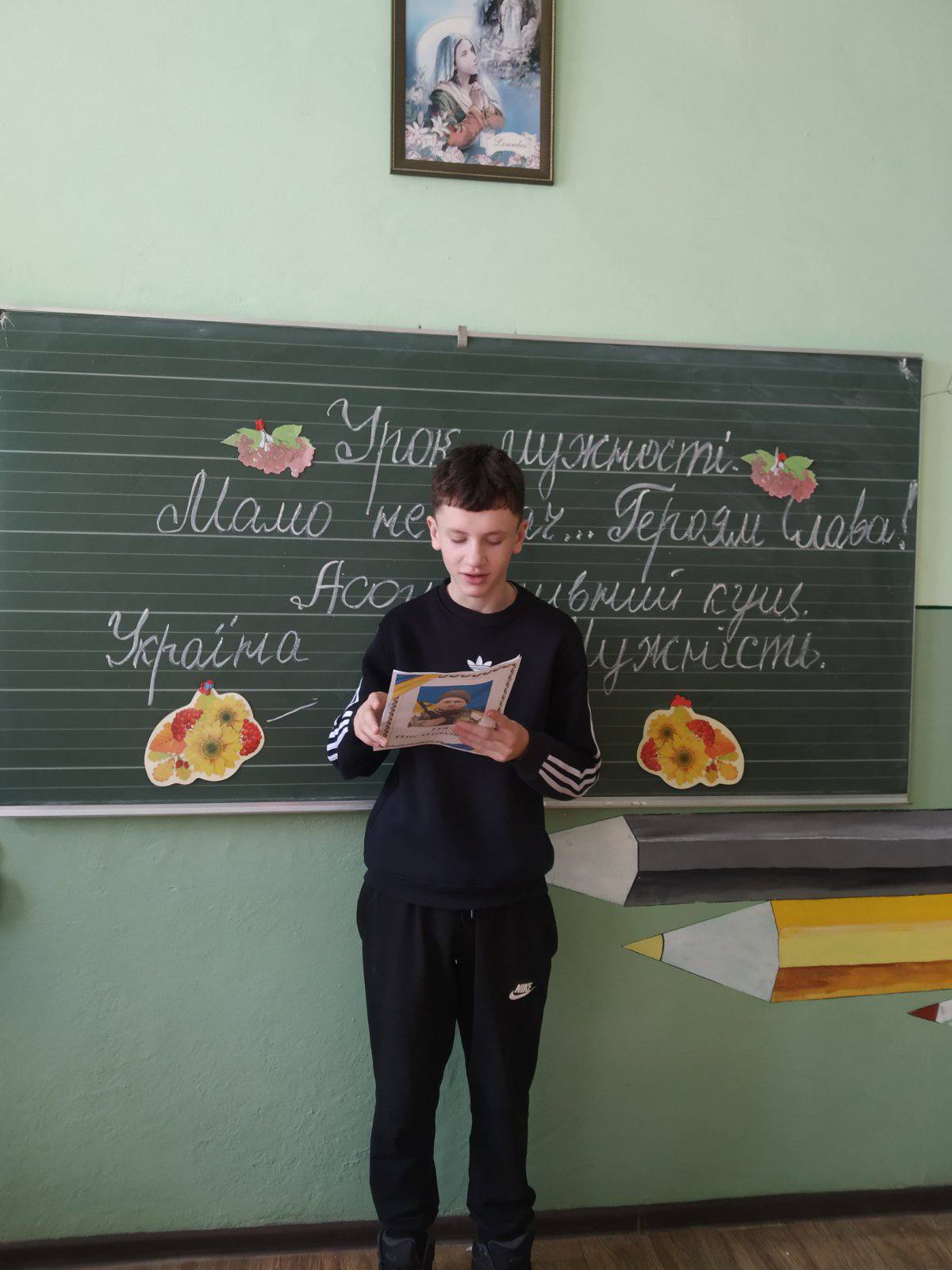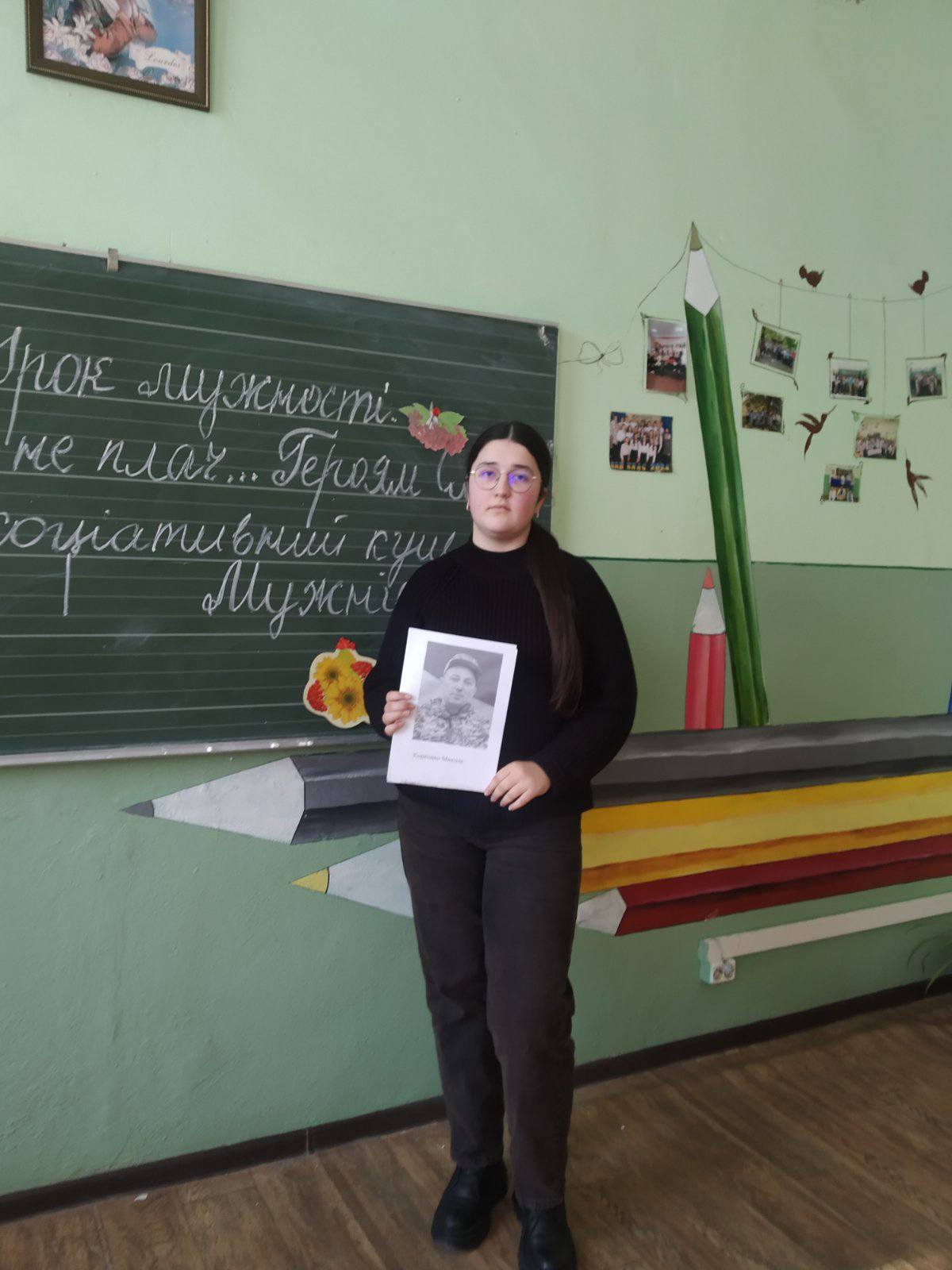 У 9 класі було проведено урок мужності “Мамо, не плач…Героям Слава! ” , спрямований на виховання в учнів патріотизму та поваги до захисників України.Урок розпочався з хвилини мовчання за загиблими воїнами .Під час уроку учні разом з вчителем зарубіжної літератури О.Ф.Фендак обговорили поняття ,, герой” , ,,мужність” , ” “патріотизм”.Учні декламували поезію (зокрема вірш – реквієм Оксани Максимишин- – Корабель ,,Мамо, не плач…” ) ,говорили про значення гасла ,,Героям Слава” в сучасній історії України.Діти підготували та презентували власні творчі роботи про воїнів -односельців ,які загинули, захищаючи свободу ,переглядали відеоматеріал, створений учнями ,,Війна регоче в холодочку “.