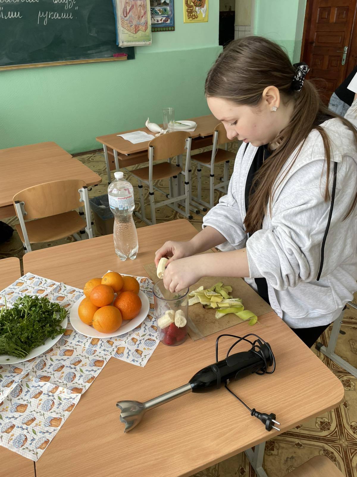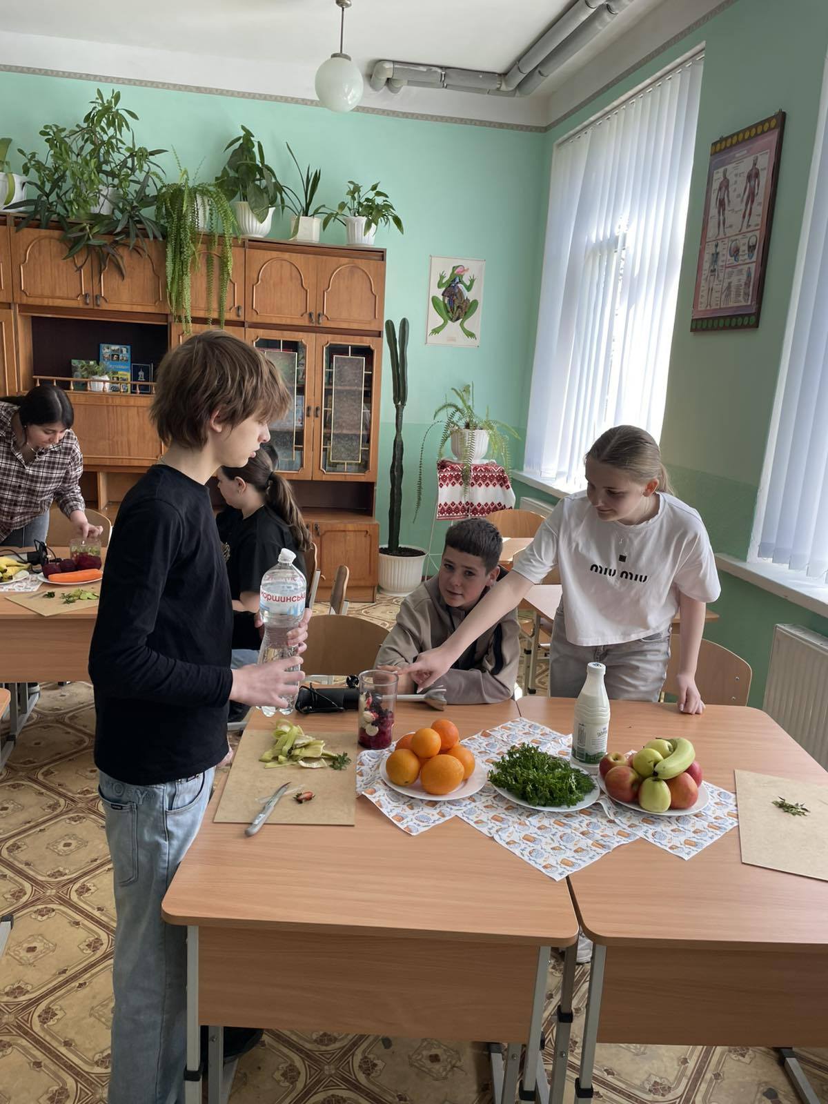У рамках тижня біології та хімії, сьогодні, вчителем біології, Дудою М.В.з учнями 8-А класу був проведений майстер-клас: “Корисні смузі своїми руками”.